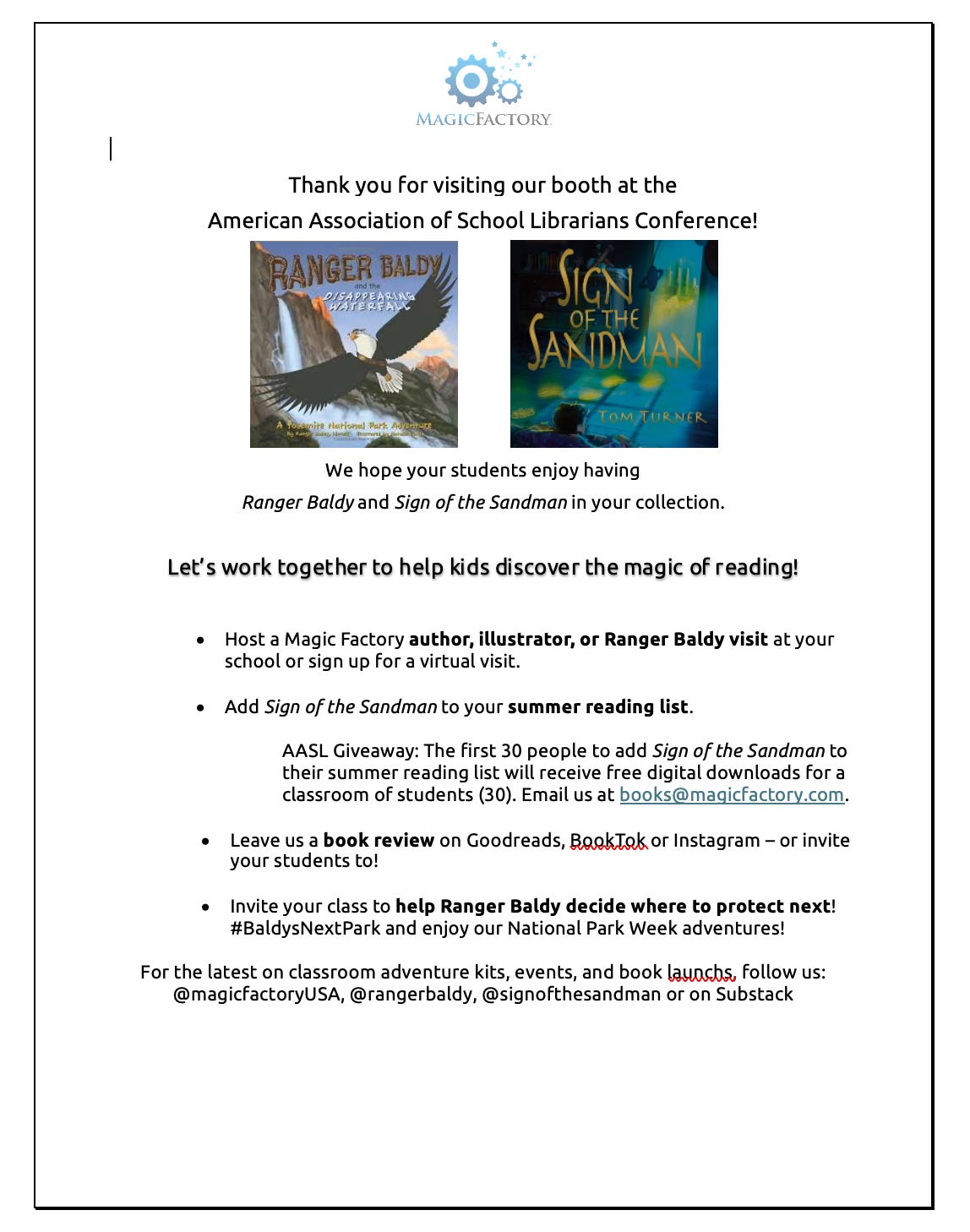 Library & School ScoopThanks for visiting us at AASL25Looking forward to visiting your schools and libraries, working together during National Park Week, and more!The Magic FactoryOct 17, 2025ShareNext